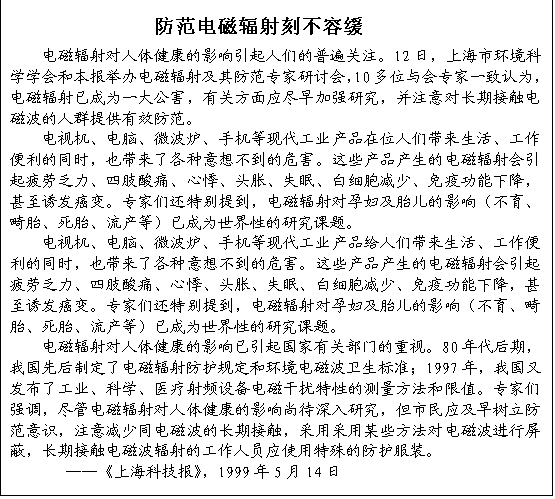 4 、对于电磁辐射的重点单位要严格监控其电磁辐射量,在其周围种植绿化带、防护林,对辐射超标这给予重罚,并勒令其限期整改。在这些单位的员工中大力开展对电磁辐射的学习活动,定期对员工进行体检。辐射强的单位应给职工发放防护服。